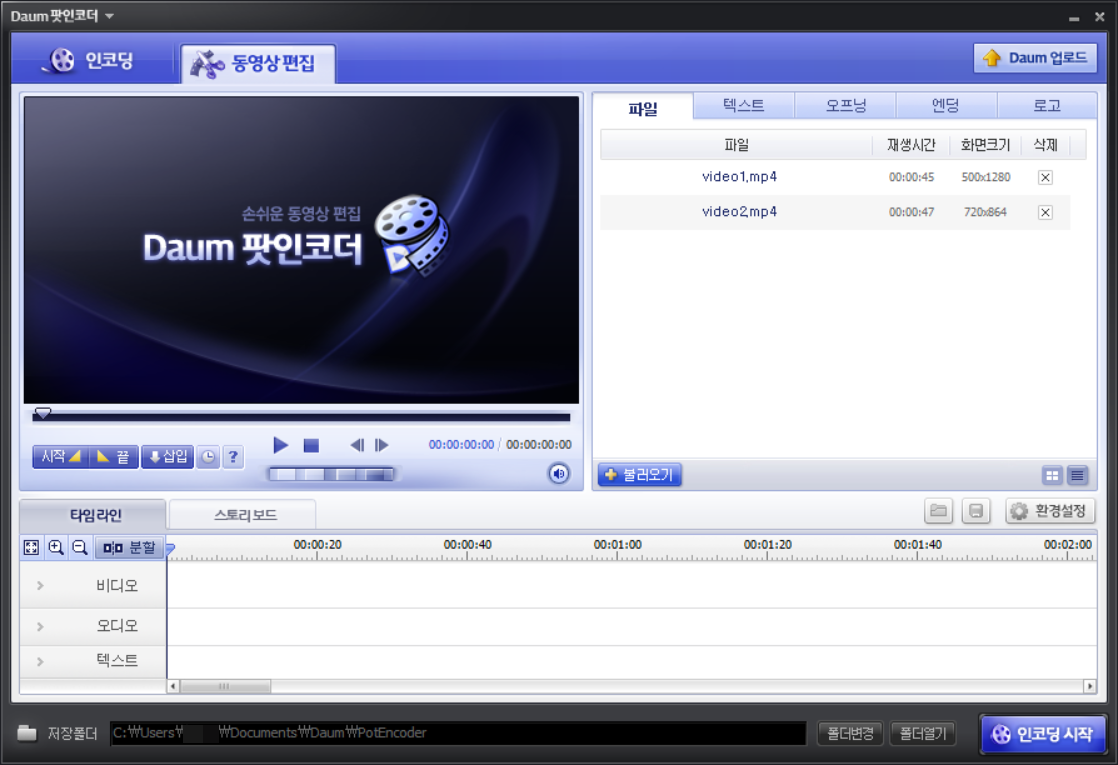 다음으로는 출력 파일의 저장 위치를 설정해야 합니다. 기본 저장위치는 C:\Users\사용자이름\Documents\Daum\PotEncoder 폴더에 저장되구요. 저장위치를 변경하려면