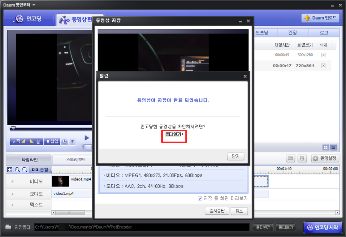 완료되면 폴더열기 를 눌러 설정한 저장 폴더로 이동하여 합쳐진 동영상 파일을 확인하시면 됩니다. 정상적으로 합쳐졌다면 여러 개의 영상이 순서대로 이어진 하나의 동영상 파일이 생성되어 있을 것입니다.