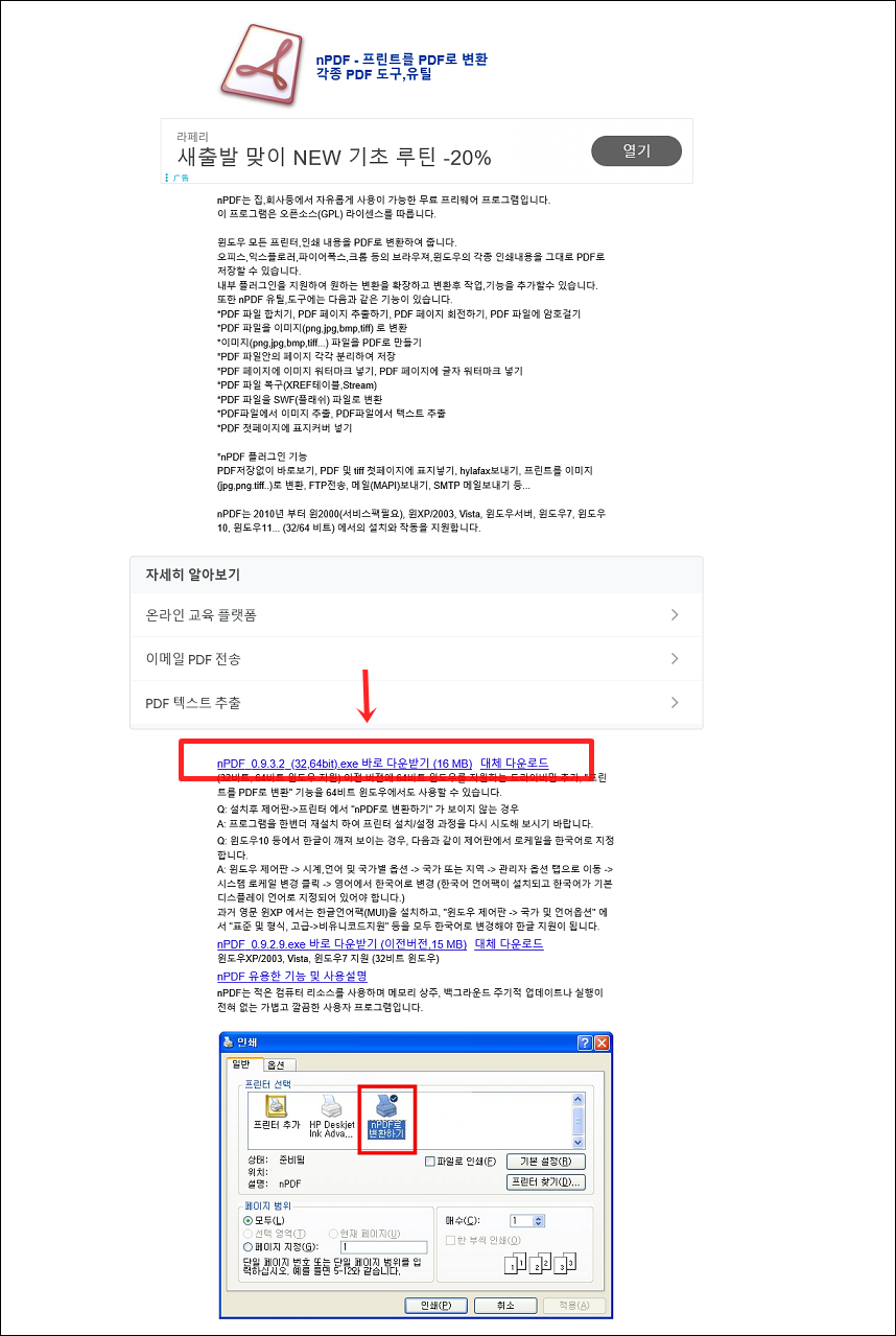 사이트로 들어간후 "nPDF_0.9.3.2_(32,64bit).exe 바로 다운받기 (16 MB) 대체 다운로드" 를 눌러 다운받아주세요.