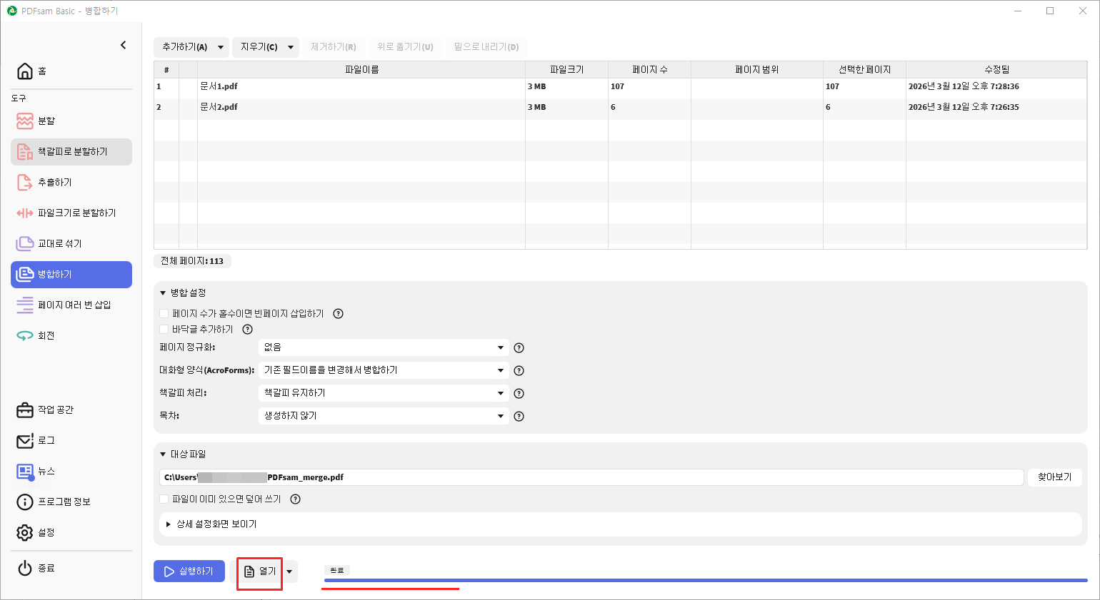 합치기 끝나면 완료라고 뜹니다. 열기 를 눌러 변환된 파일을 확인해주세요.