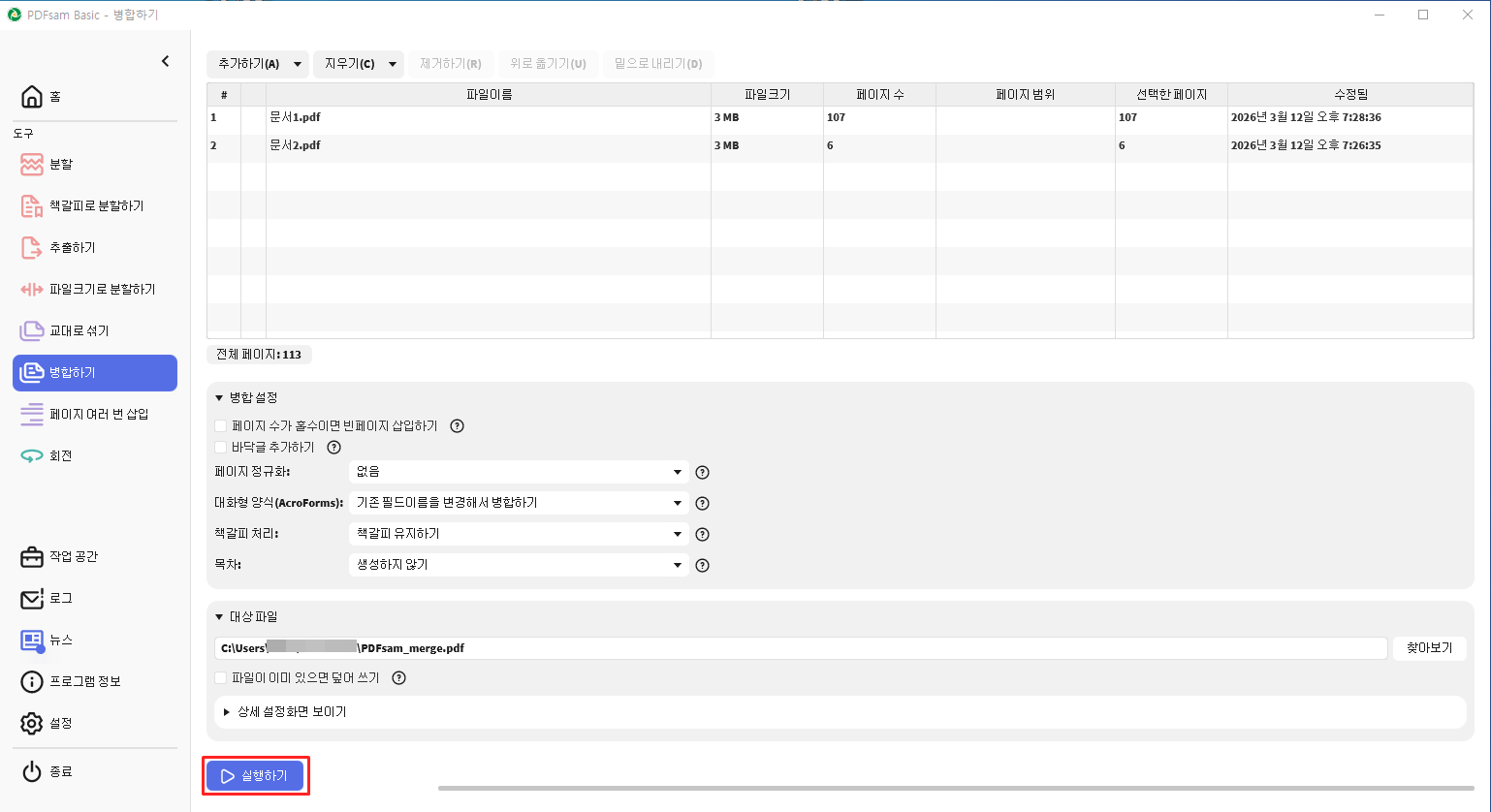 PDF 파일을 프로그램 창에 끌어다 놓은 후 순서를 정리하고 실행 버튼을 누르면 간단하게 병합할 수 있습니다. 또한 모든 작업이 컴퓨터에서 직접 처리되기 때문에 파일을 서버에 업로드할 필요가 없어 보안 측면에서도 안전합니다.