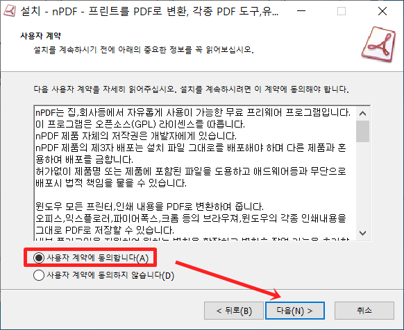 "사용자 계약에 동의합니다." 선택후 다음 버튼을 눌러주세요.