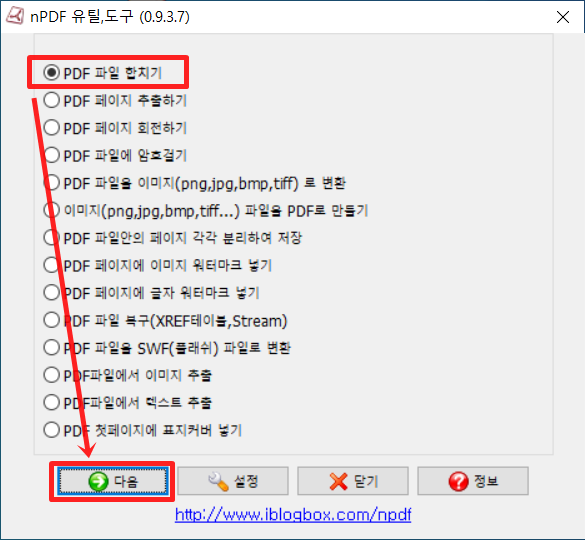"PDF 파일 합치기" 를 선택후 다음 버튼을 눌러주세요.
