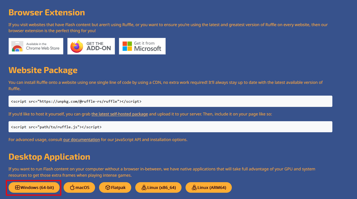 1. https://ruffle.rs/ 여기에서 Ruffle 프로그램 또는 브라우저 확장 프로그램 설치