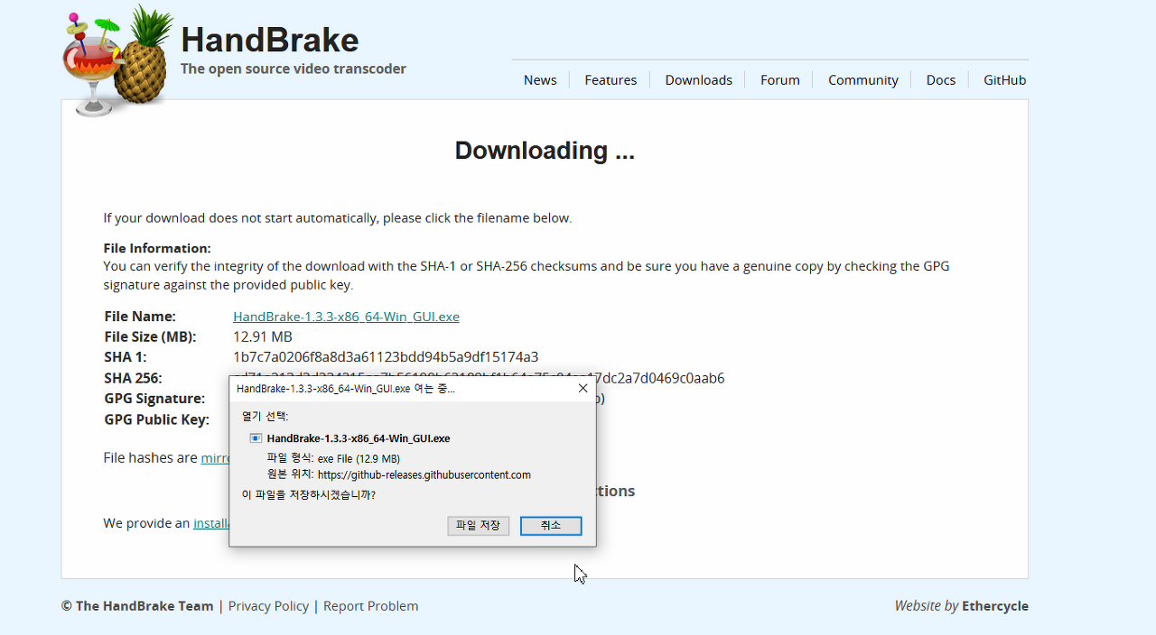 다운이 완료되면 HandBrake 설치파일을 더블클릭해서 실행해주세요.